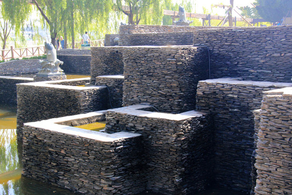 (8)不同水體形態之間以及水體和其他元素的結合使用可豐富環境的多樣性。設計中通常是多種形式的水體組合使用,如跌水和靜水的結合、噴泉和跌水的結合等;也要注意水體和植被、山石等元素結合起來設計;還要考慮與水生動植物的結合,各種不同的動植物,如水中的荷蓮、水邊的蘆葦、各種魚類等,這樣既能體現生物的多樣性,也能增加空間的趣味性。