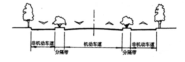 以兩條分隔帶隔離機(jī)動(dòng)車與非機(jī)動(dòng)車車道,將車行道一分為三的橫斷面形式。