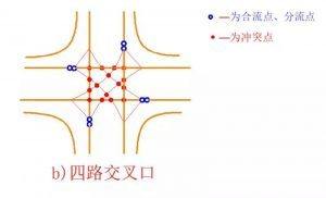 四路十字形交叉口,16個沖突點、8個合流點、分流點。