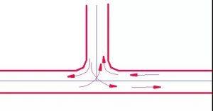 當主要公路的直行、轉彎交通量較大時,則采用在主要公路和次要公路上均設分隔島的渠化T形交叉。
