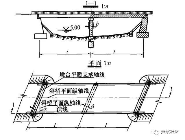 4)斜橋傾斜角a,應(yīng)采用斜橋平面縱軸線的法線與墩臺平面支承軸線的夾角標(biāo)注(圖2-64)。