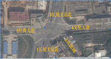 該交叉口位于江西省南昌市新建區(qū)中心城區(qū)西部。由長(zhǎng)堎大道、紅灣大道、文化大道、興國(guó)路五路交叉組成。其中長(zhǎng)堎大道南北方向雙向六車道主干道,紅灣大道、文化大道是連接新建區(qū)和灣里區(qū)的主要交通干道,興國(guó)路連接新建區(qū)中心城區(qū)并設(shè)有多條公交線路。該交叉處在新建區(qū)大力開發(fā)地段,周邊居民區(qū)密集、各道路沿途設(shè)有多家商業(yè)和購(gòu)物中心,并輻射周邊的高校園區(qū)和工業(yè)園區(qū)。由于交叉口交通流量較大、多路相交,加上長(zhǎng)堎大道建成通車后未能對(duì)交叉口各進(jìn)出口道和內(nèi)部空間進(jìn)行科學(xué)合理的交通渠化設(shè)計(jì),導(dǎo)致交通混行,交通擁堵現(xiàn)象經(jīng)常發(fā)生。交叉口現(xiàn)狀如圖-1所示。