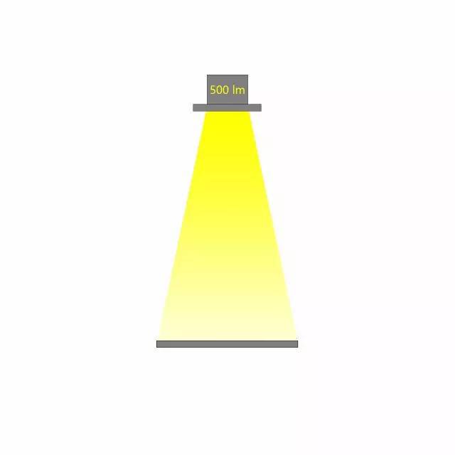 相同光通量的燈具,不同的配光角度,在相同的距離照射到同一個平面,所產(chǎn)生的照度是不同的。配光角度越大,相同距離的照度越小。如下圖,燈具的光通量為500lx,當(dāng)配光角度不同時,相應(yīng)的照度也會不同。