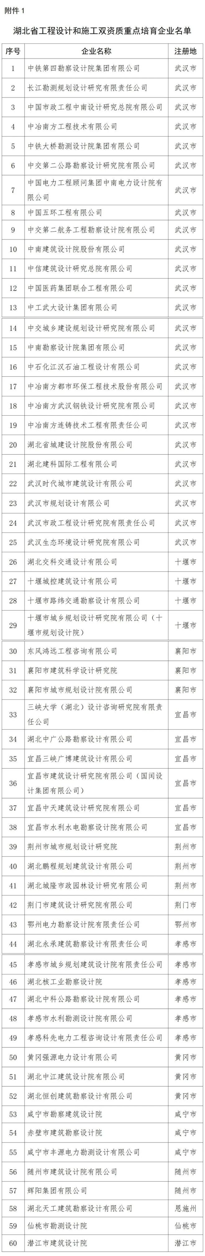 為貫徹落實《關于促進全省工程勘察設計行業高質量發展的若干措施》(鄂建文〔2022〕9號),培育同時具備設計資質和施工資質的骨干建筑企業,促進工程設計與施工融合發展,更好實施工程總承包模式,深化工程建設組織方式改革。經企業自愿申請、市州審核推薦、省廳綜合審定、依法公開公示,現正式公布湖北省工程設計和施工雙資質重點培育企業名單,并就有關事項通知如下: