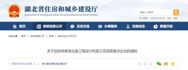 1月3日,湖北省住建廳發布《關于加快培育湖北省工程設計和施工雙資質重點企業的通知》。
